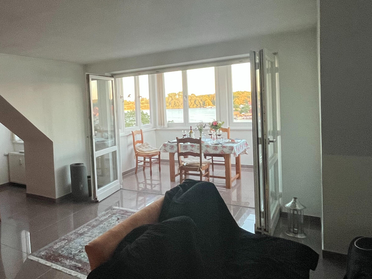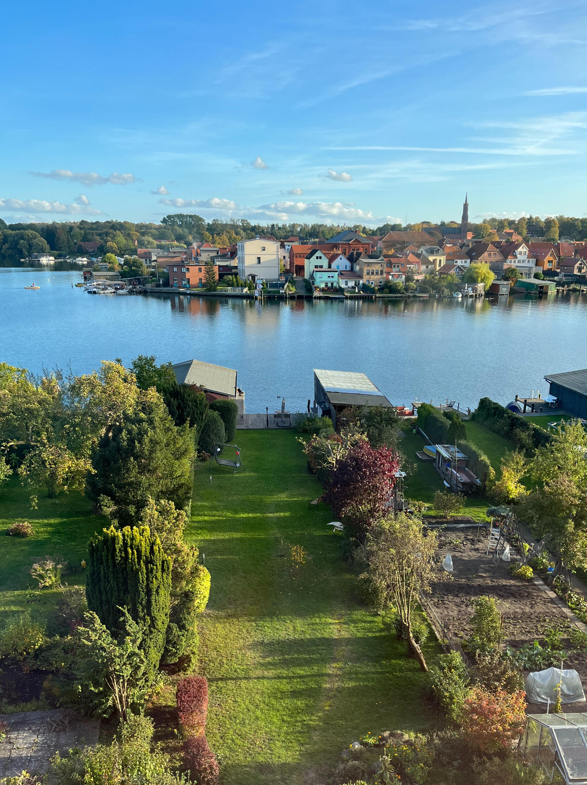 Erleben Sie erholsame Tage in einer stilvollen, mehrgeschossigen Ferienwohnung mit Blick über das Grundstück hinweg auf den See. Der großzügige Garten steht Ihnen zur Mitnutzung zur Verfügung – ebenso wie der private Steg, an dem Sie sogar mit dem Boot anlegen können.